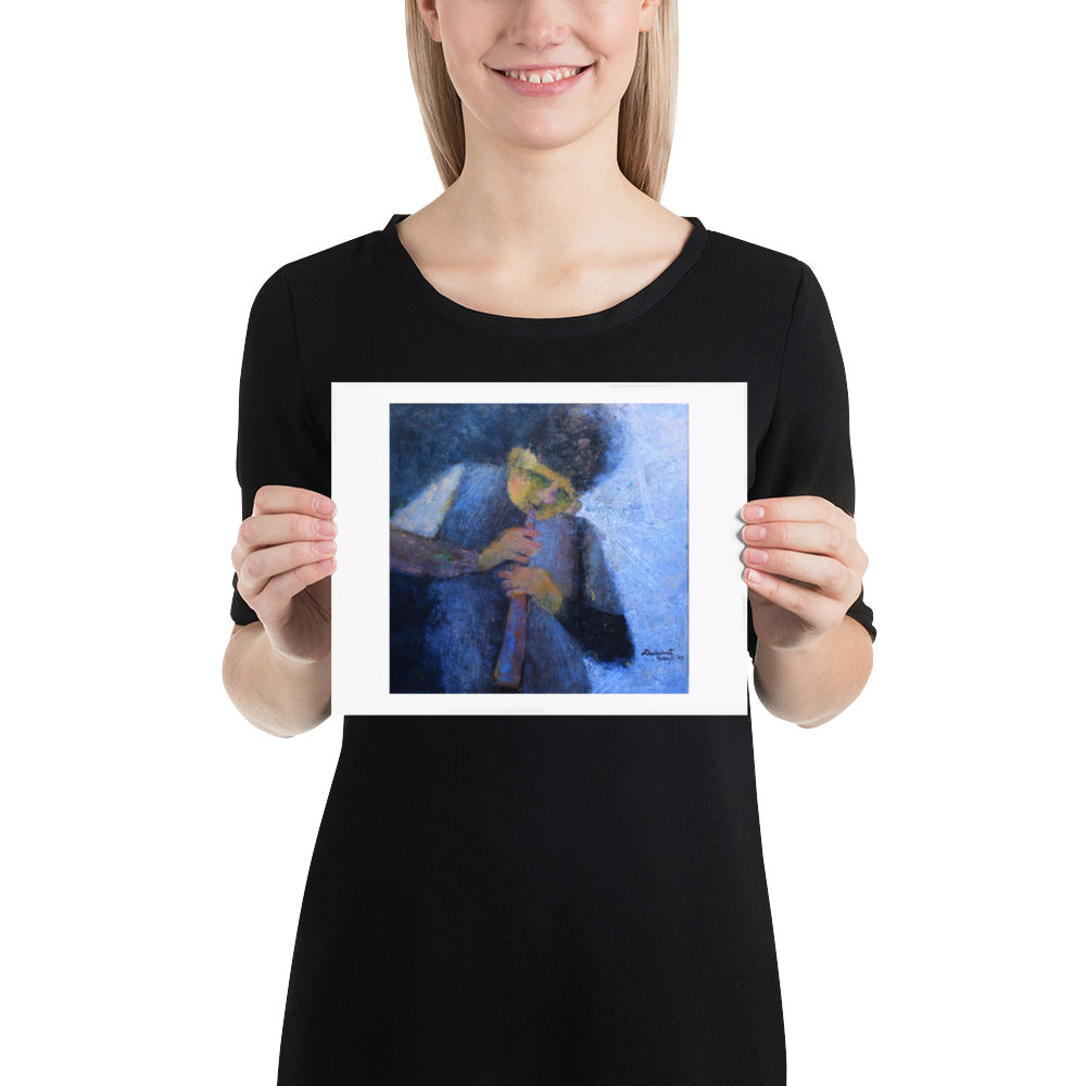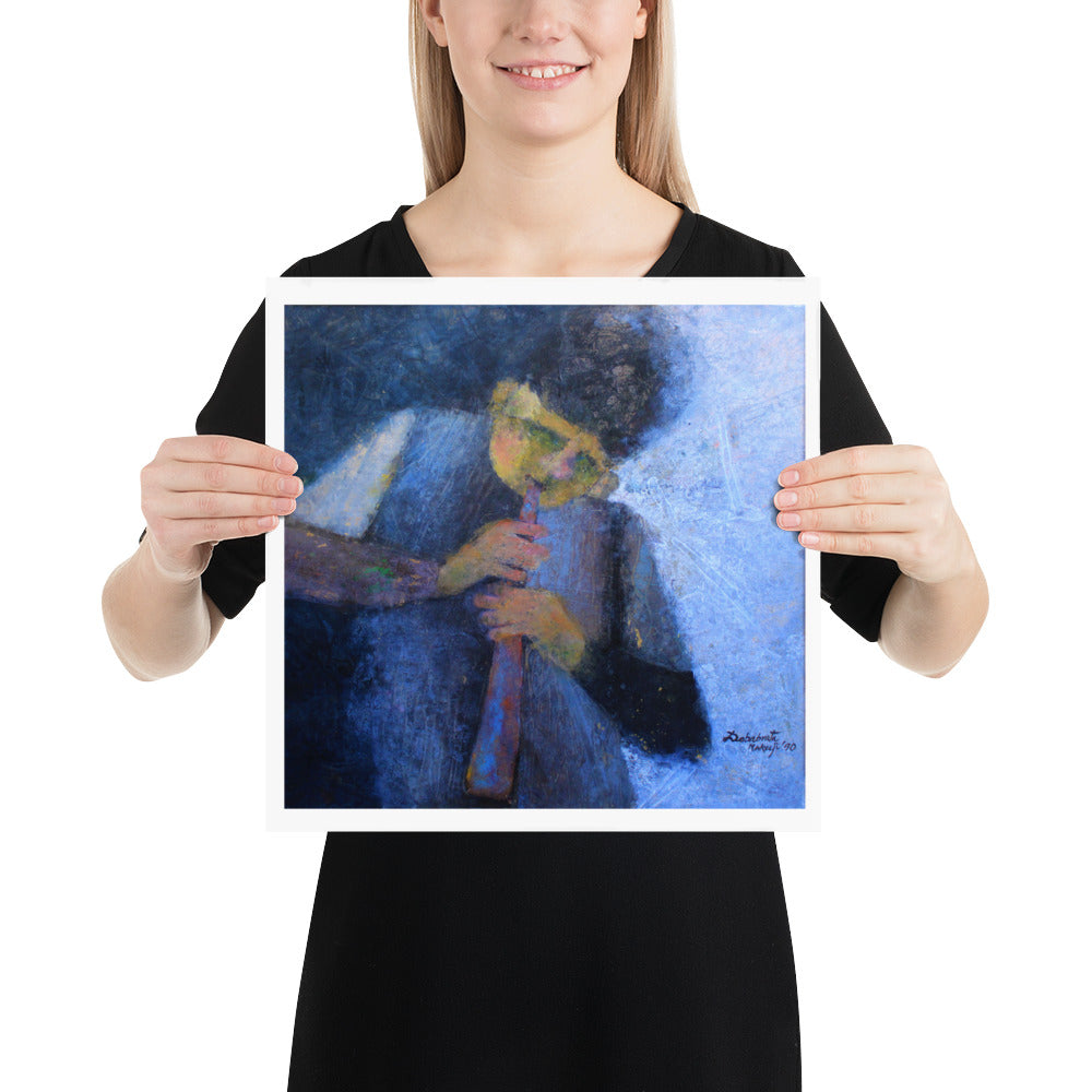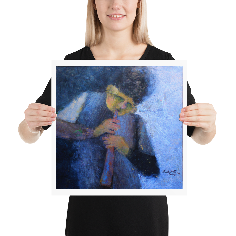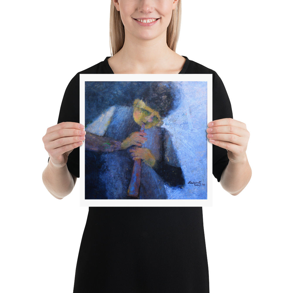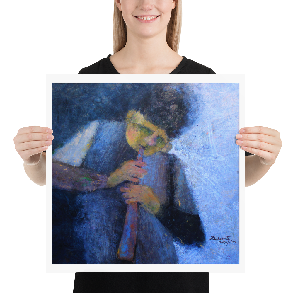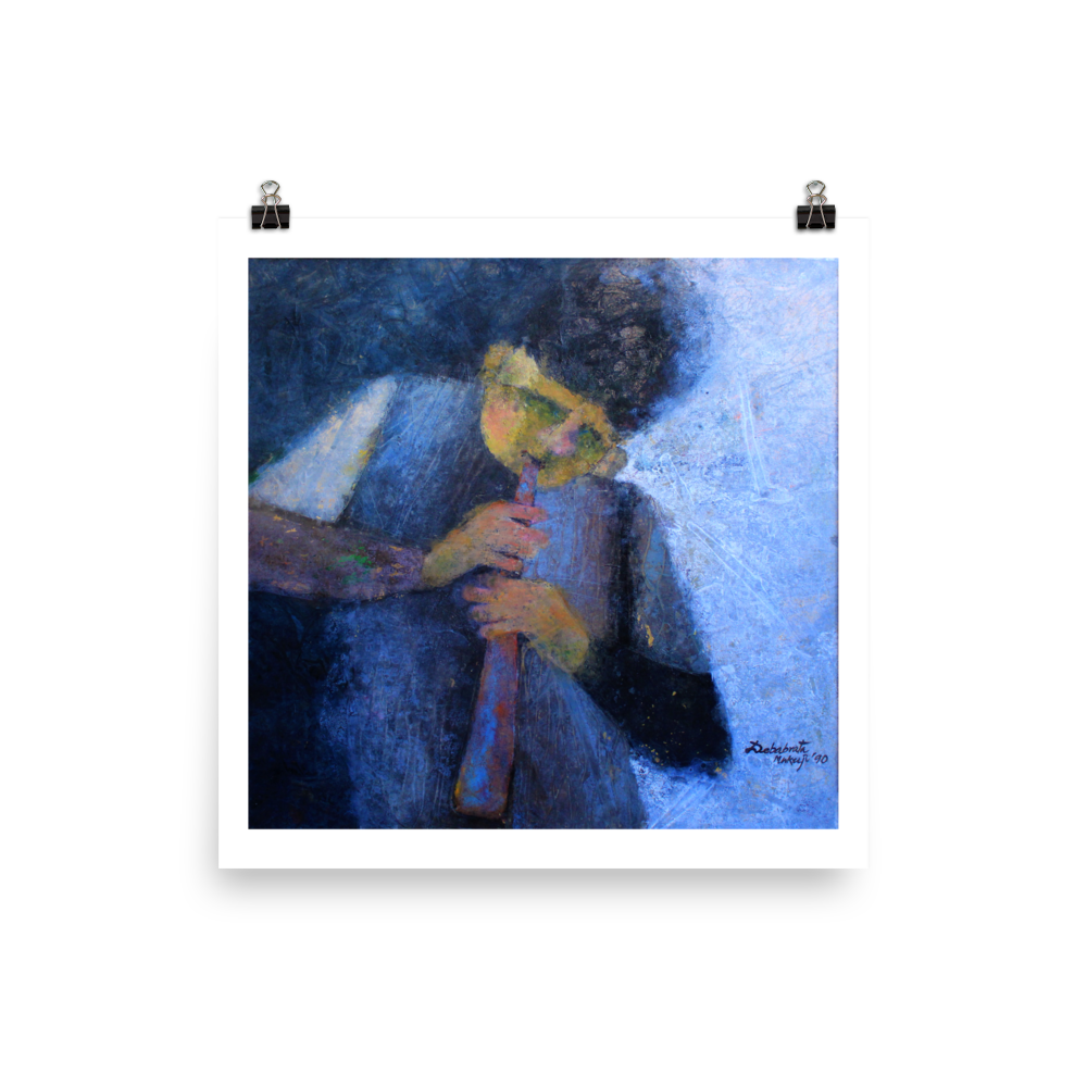A dramatic rendition of a man playing the flute painted with oil on canvas by the masterful Montreal artist Debabrata Mukerji. 1990.